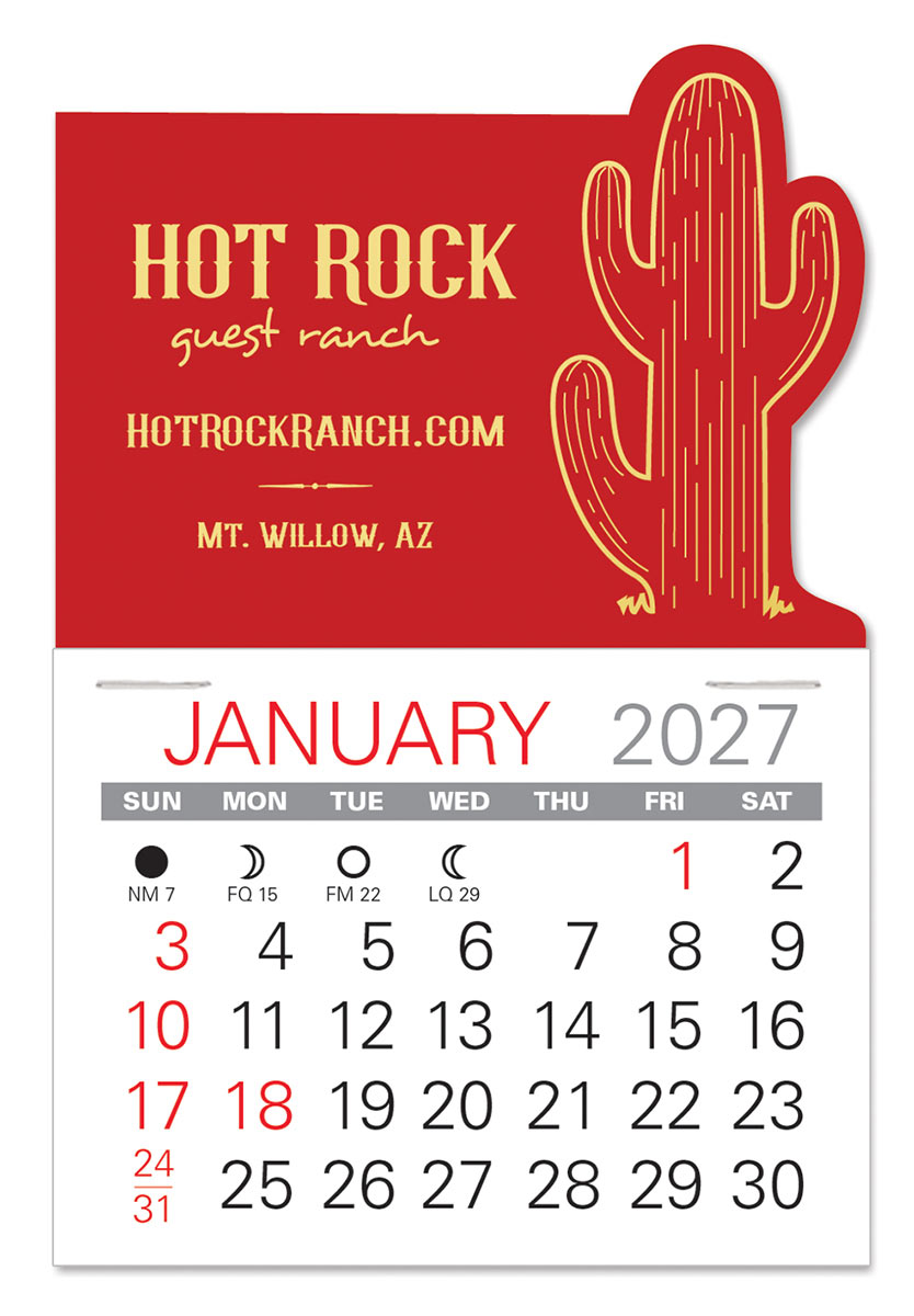 Low cost, self-adhering stick-on calendars with a cactus design can go anywhere and are the ideal way to keep your name in front of customers and prospects all year long. Available in 6 vinyl colors for most any business.