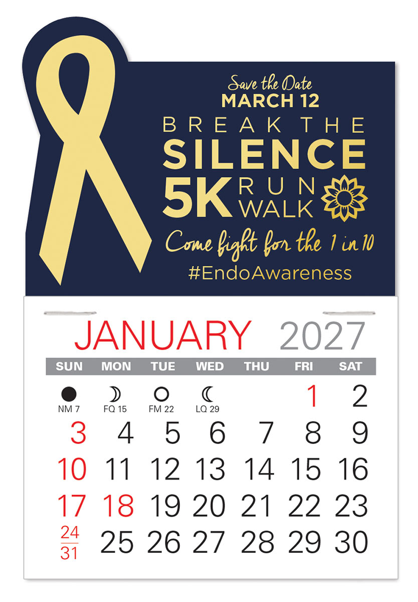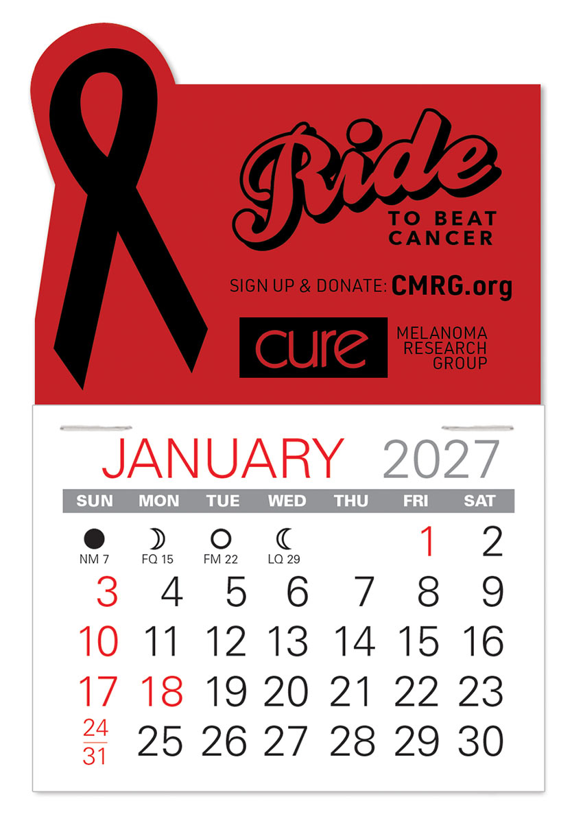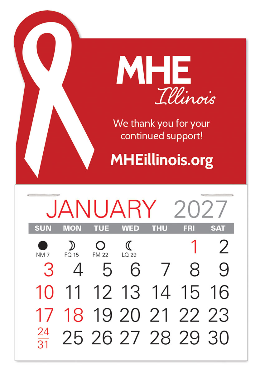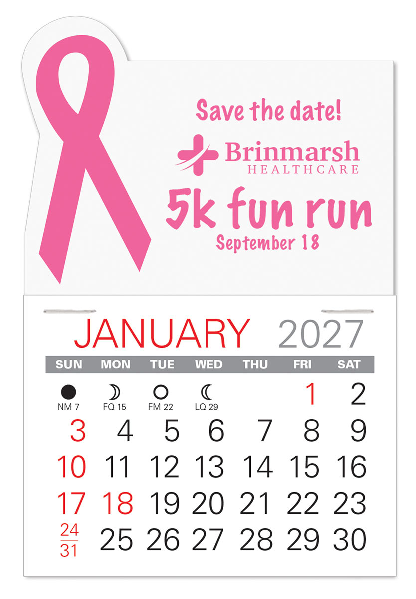 Low cost, self-adhering Awareness Ribbon stick-on calendars can go anywhere and are the ideal way to keep your name in front of customers and prospects all year long. Available in 6 vinyl colors for most any cause, non-profit, or organization.